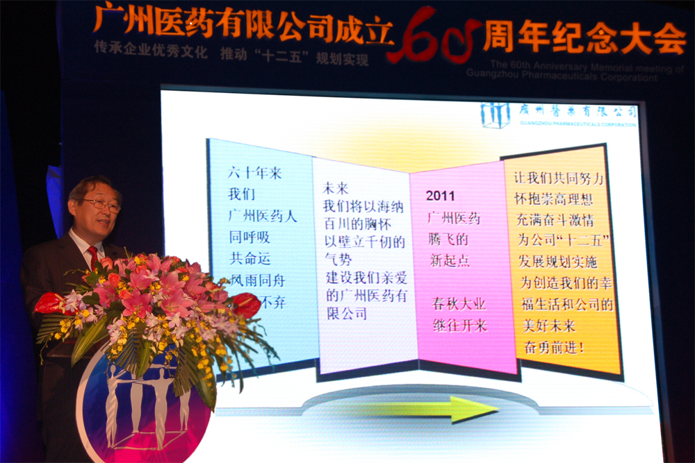 2011年12月10日,廣州醫(yī)藥有限公司60周年紀(jì)念大會在蓓蕾劇院隆重舉行,大會回顧了廣州醫(yī)藥有限公司在中國醫(yī)藥流通行業(yè)巋然挺立六十年的光輝歷程;用激情昂揚(yáng)的“十二五”宣講,顯現(xiàn)出欲打造“中國醫(yī)藥行業(yè)供應(yīng)鏈佳服務(wù)商”的魄力和決心;企業(yè)員工還用自編自導(dǎo)自演的文藝節(jié)目展現(xiàn)昂揚(yáng)的企業(yè)精神風(fēng)貌。大會得到各界領(lǐng)導(dǎo)大力支持,中國醫(yī)藥政研會、中國醫(yī)藥企業(yè)文化建設(shè)協(xié)會常務(wù)顧問張漢華蒞臨恭賀,廣藥集團(tuán)董事長、黨委書記楊榮明,廣藥集團(tuán)黨委副書記、紀(jì)委書記楊秀微,廣藥集團(tuán)工會主席齊兆基,廣藥集團(tuán)副總經(jīng)理、廣州醫(yī)藥有限公司黨委書記施少斌等集團(tuán)領(lǐng)導(dǎo)出席了盛會,與廣州醫(yī)藥有限公司領(lǐng)導(dǎo)班子和1200多名員工齊聚一堂,共襄盛舉。