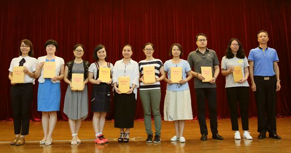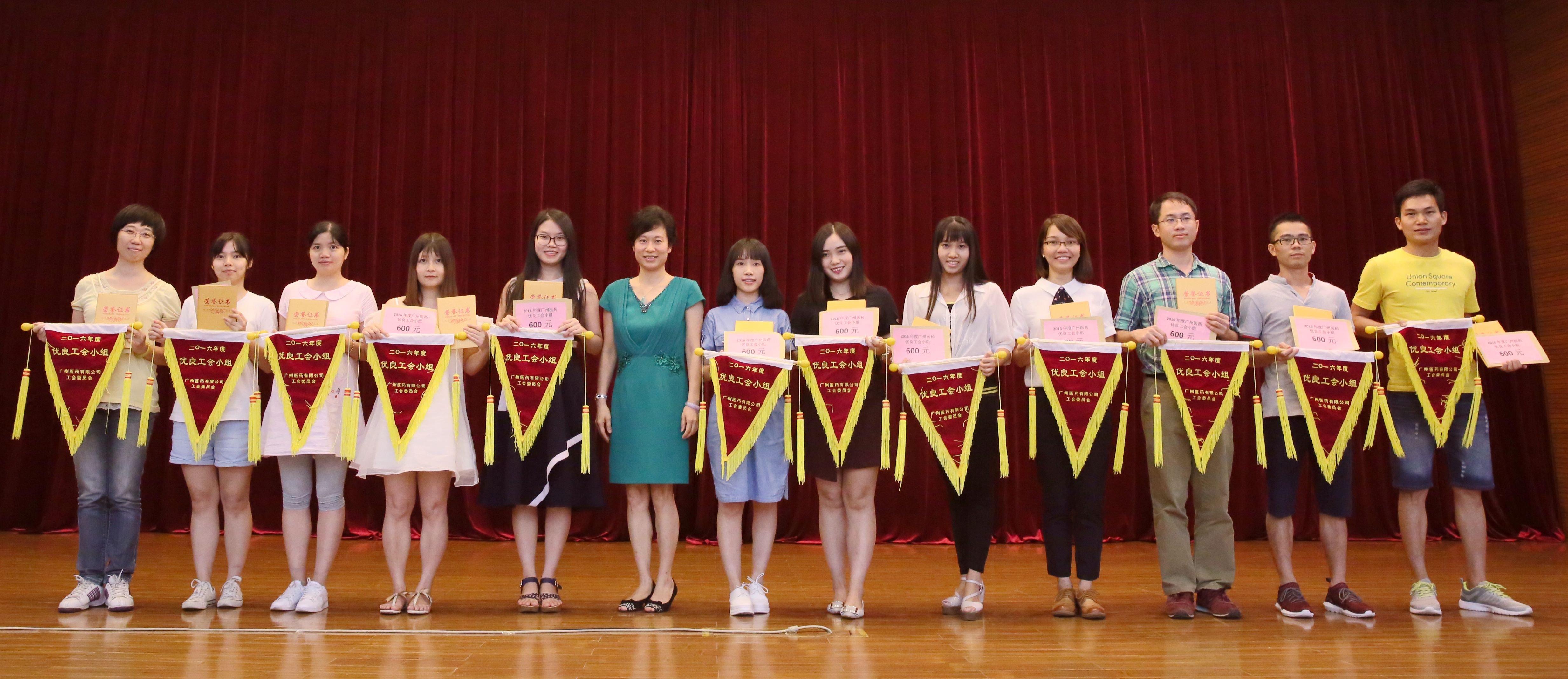 廣州醫(yī)藥紀(jì)委委員、本部黨總支部書(shū)記、人力資源部總監(jiān)周敏華(左六)為“2016年度行業(yè)工會(huì)優(yōu)良小組、組長(zhǎng)”獲獎(jiǎng)代表頒獎(jiǎng)