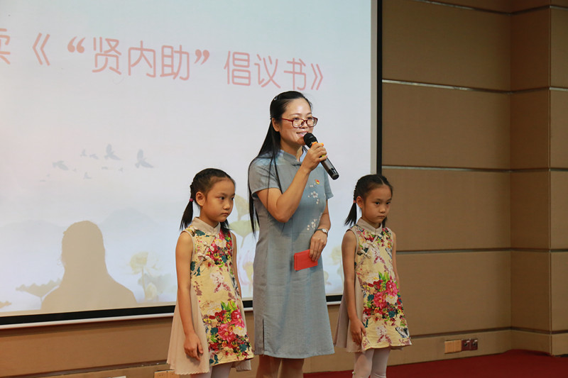 黨員代表陳康棟妻子攜雙胞胎女兒上臺(tái)宣讀《“賢內(nèi)助”倡議書(shū)》