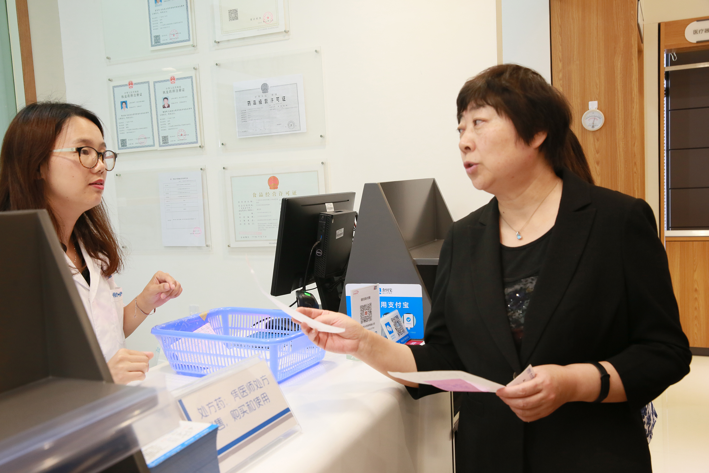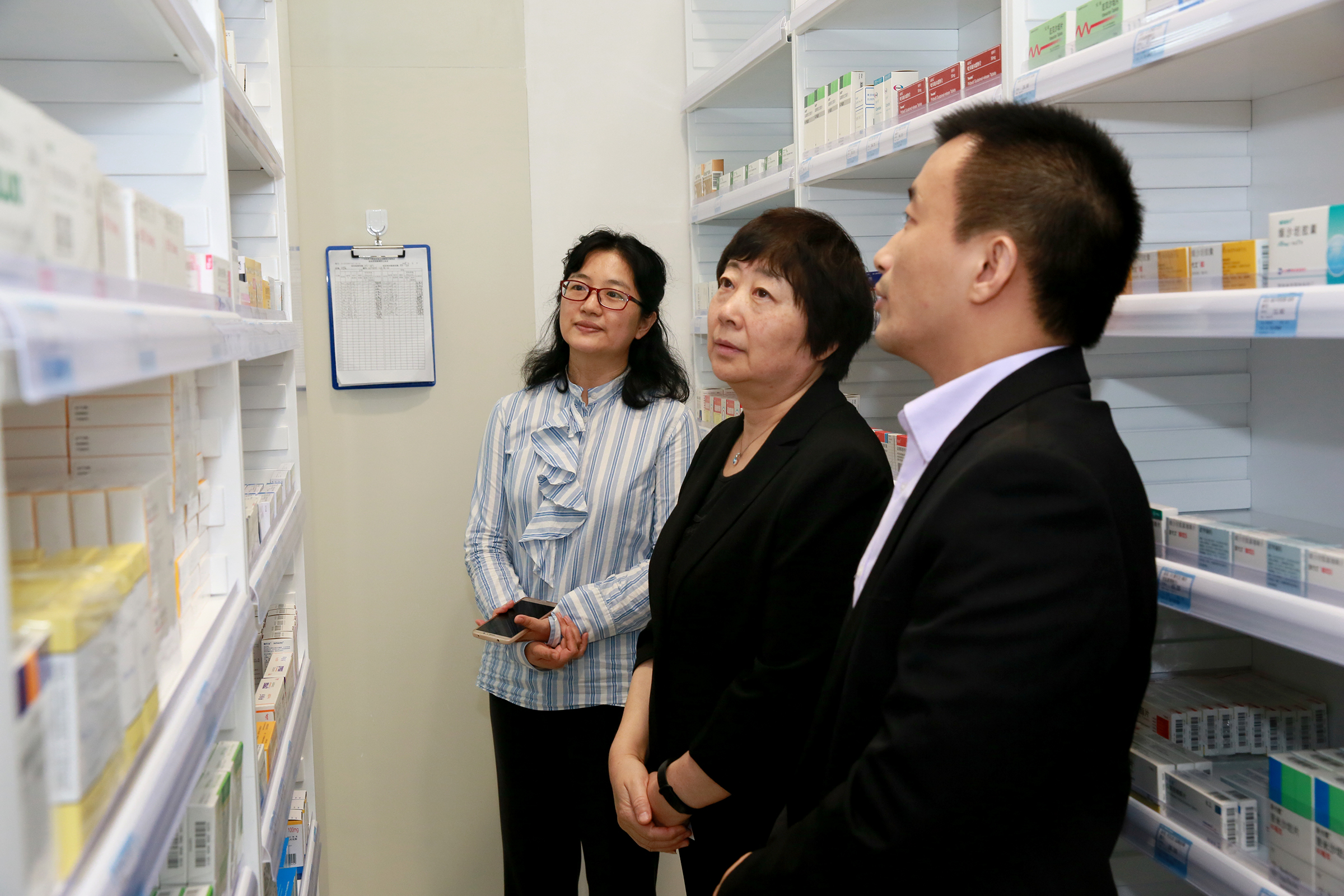 穆小紅副司長(右)向門店員工了解處方藥銷售的情況