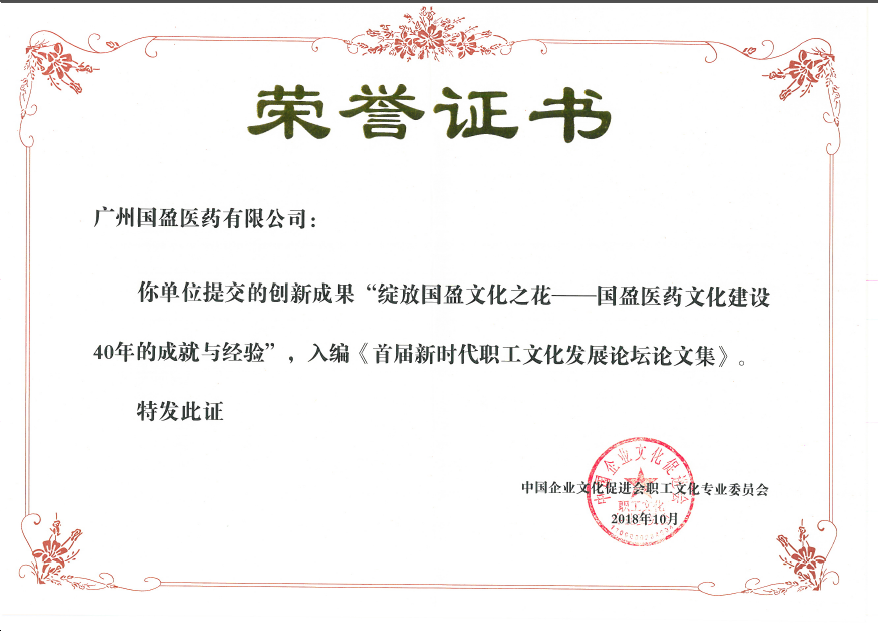 廣州醫(yī)藥工會選送的國盈醫(yī)藥成果“綻放國盈文化之花-國盈醫(yī)藥文化建設(shè)40年的成就與經(jīng)驗”榮獲入編《首屆新時代職工文化發(fā)展論壇論文集》。會議期間,專委會為其頒發(fā)榮譽證書。