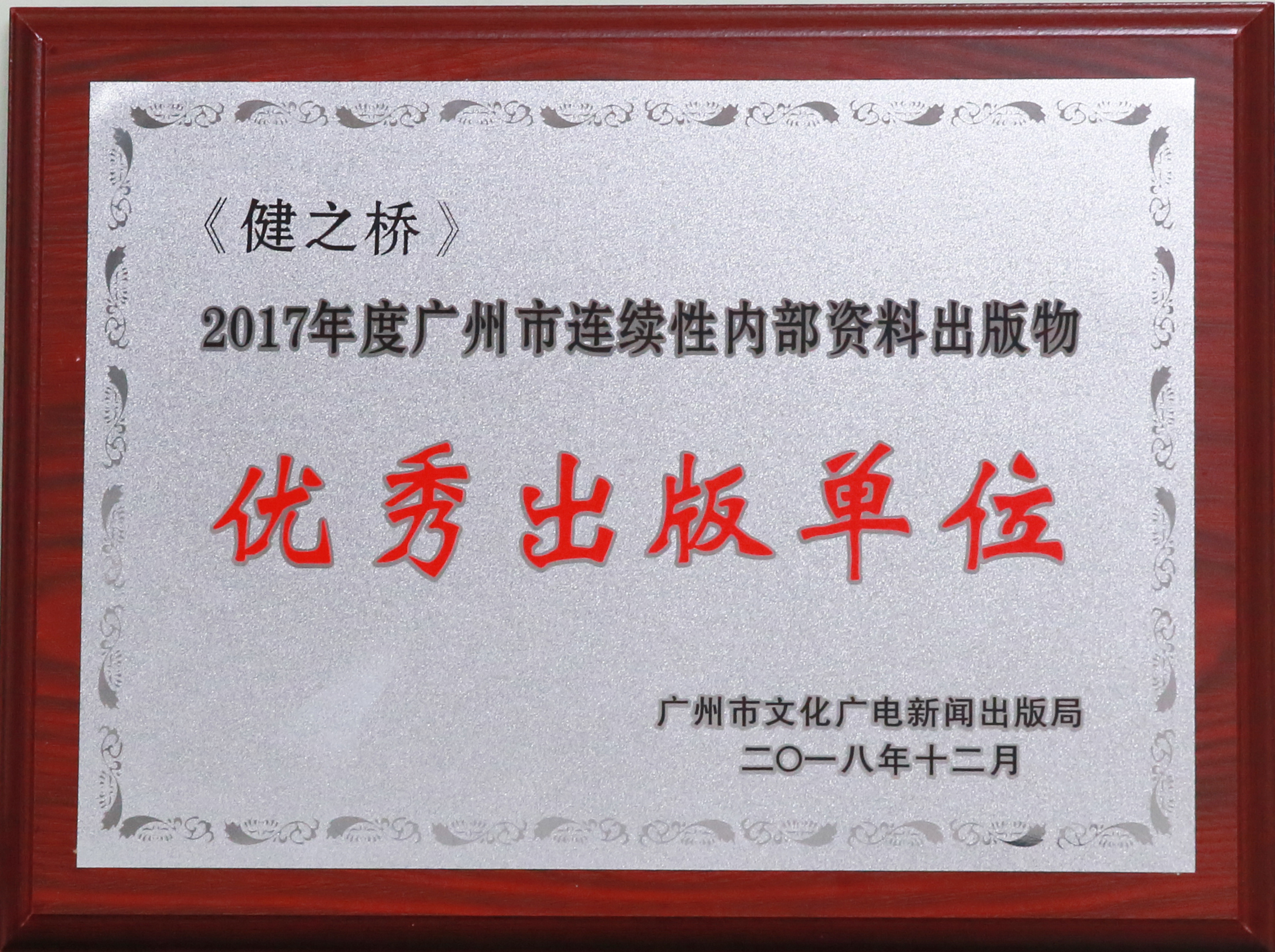 12月5日,廣州市文化廣電新聞出版局(下稱市文廣新局)召開廣州市第六屆市屬連續(xù)性內(nèi)部資料出版物展示暨表彰大會。會上,《健之橋》從214家登記在冊的市屬內(nèi)部資料性出版物當(dāng)中脫穎而出,獲評為“優(yōu)秀出版單位”,這也是《健之橋》繼續(xù)2014、2015年后再次獲得此項殊榮。