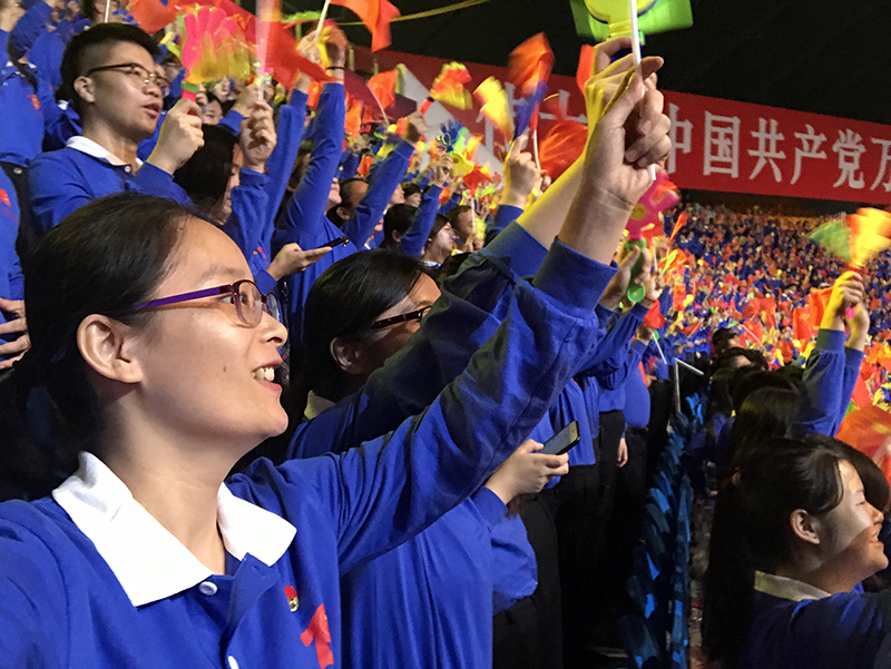 大灣區(qū)作為首發(fā)方陣率先高唱《沒有共產(chǎn)黨就沒有新中國》。隨后,《我和我的祖國》《愛我中華》《龍的傳人》《走向復(fù)興》等歌曲在各個(gè)方陣中此起彼伏,充分表達(dá)廣東省人民對(duì)新中國的深情祝福和赤子之情。最后全場(chǎng)高聲合唱《歌唱祖國》,讓整個(gè)廣州體育館到達(dá)“沸點(diǎn)”,現(xiàn)場(chǎng)所有人的情緒被“點(diǎn)燃”,手中揮舞小國旗匯成紅色的海洋。