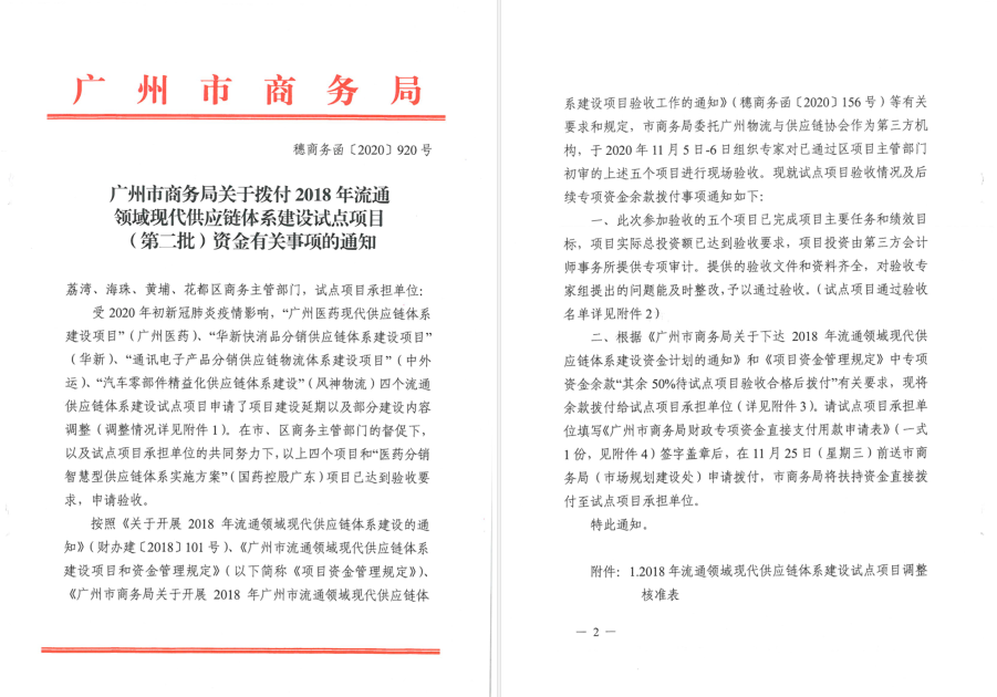 11月25日,廣州市商務(wù)局發(fā)出《廣州市商務(wù)局關(guān)于撥付2018年流通領(lǐng)域現(xiàn)代供應(yīng)鏈體系建設(shè)試點項目(第二批)資金有關(guān)事項的通知》,公告廣州醫(yī)藥申報的“廣州醫(yī)藥現(xiàn)代供應(yīng)鏈體系建設(shè)項目”已完成主要任務(wù)及績效目標(biāo),項目實際總投資額等達到驗收要求,順利通過驗收。