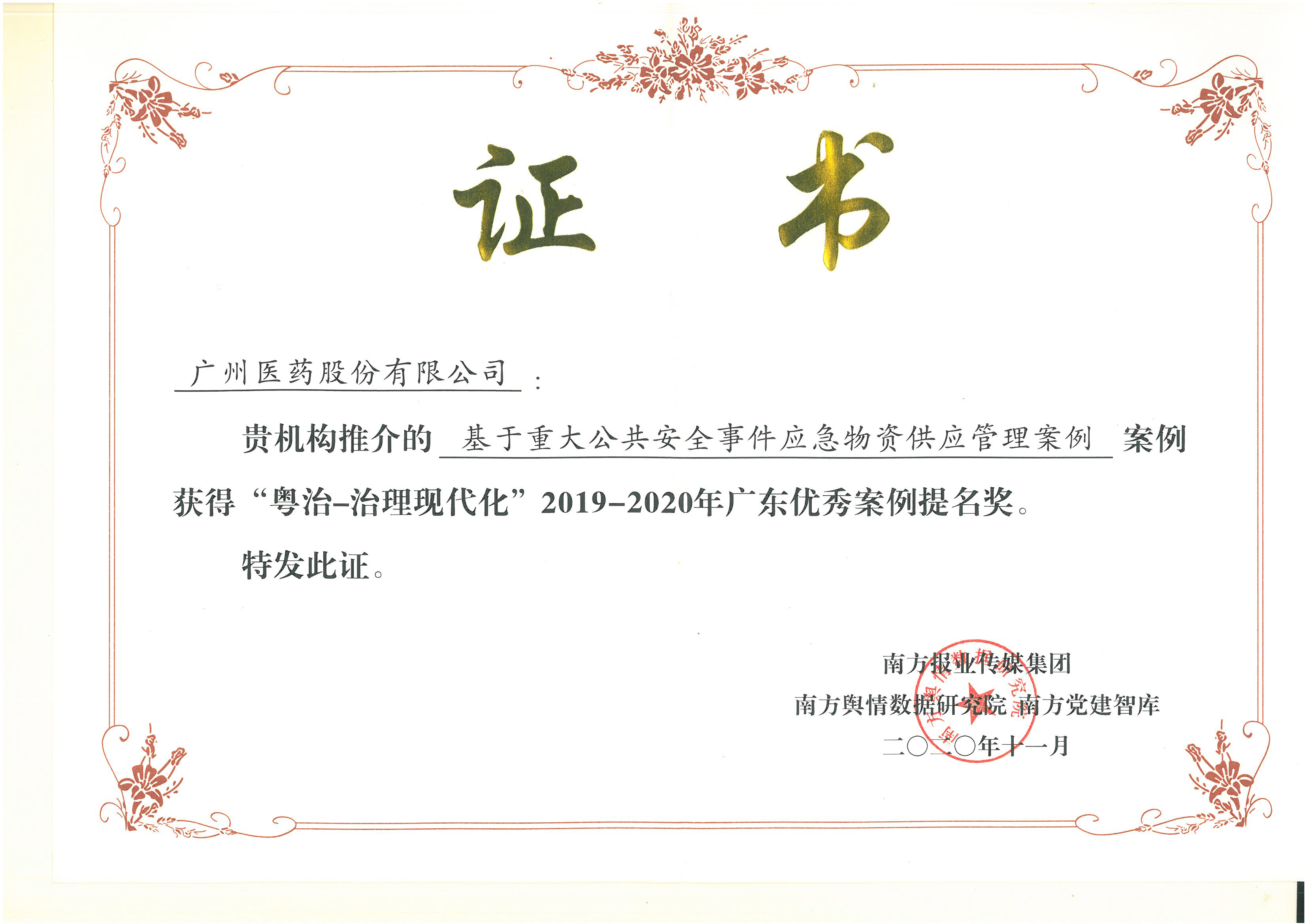 11月26日,第七屆“粵治—治理現(xiàn)代化”廣東探索經(jīng)驗(yàn)交流會(huì)在廣州舉行。該活動(dòng)由南方報(bào)業(yè)傳媒集團(tuán)主辦,南方輿情數(shù)據(jù)研究院、南方黨建智庫承辦。廣州醫(yī)藥報(bào)送的《基于重大公共安全事件應(yīng)急物資供應(yīng)管理》被評(píng)為“2019—2020年度廣東優(yōu)秀案例”提名獎(jiǎng)。