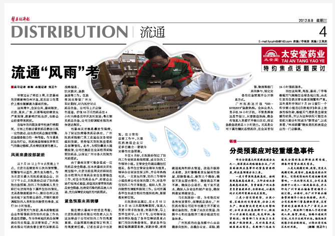 能在特大暴雨中經(jīng)受住考驗(yàn),北京醫(yī)藥股份有限公司負(fù)責(zé)人認(rèn)為這還得益于公司對防汛工作的高度重視、應(yīng)急預(yù)案的提前制訂和員工的高度責(zé)任感。記者在采訪中也發(fā)現(xiàn),在日常的運(yùn)營工作中,大型醫(yī)藥流通企業(yè)目前多已建立一套較為完善的應(yīng)急預(yù)案。