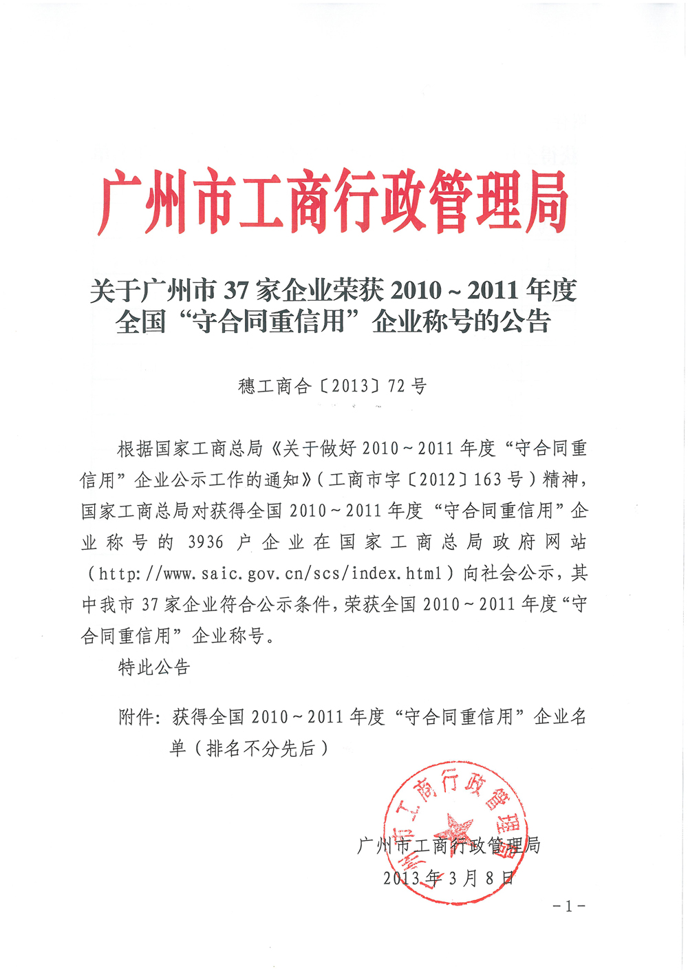 根據國家工商總局《關于做好2010-2011年度“守合同重信用”企業(yè)公示工作的通知》,經各省、地工商局推薦,國家工商總局對獲得全國2010-2011年度“守合同重信用”企業(yè)稱號的3936家(國家工商總局政府網站www.saic.gov.cn/scs/index.html)向社會公示。