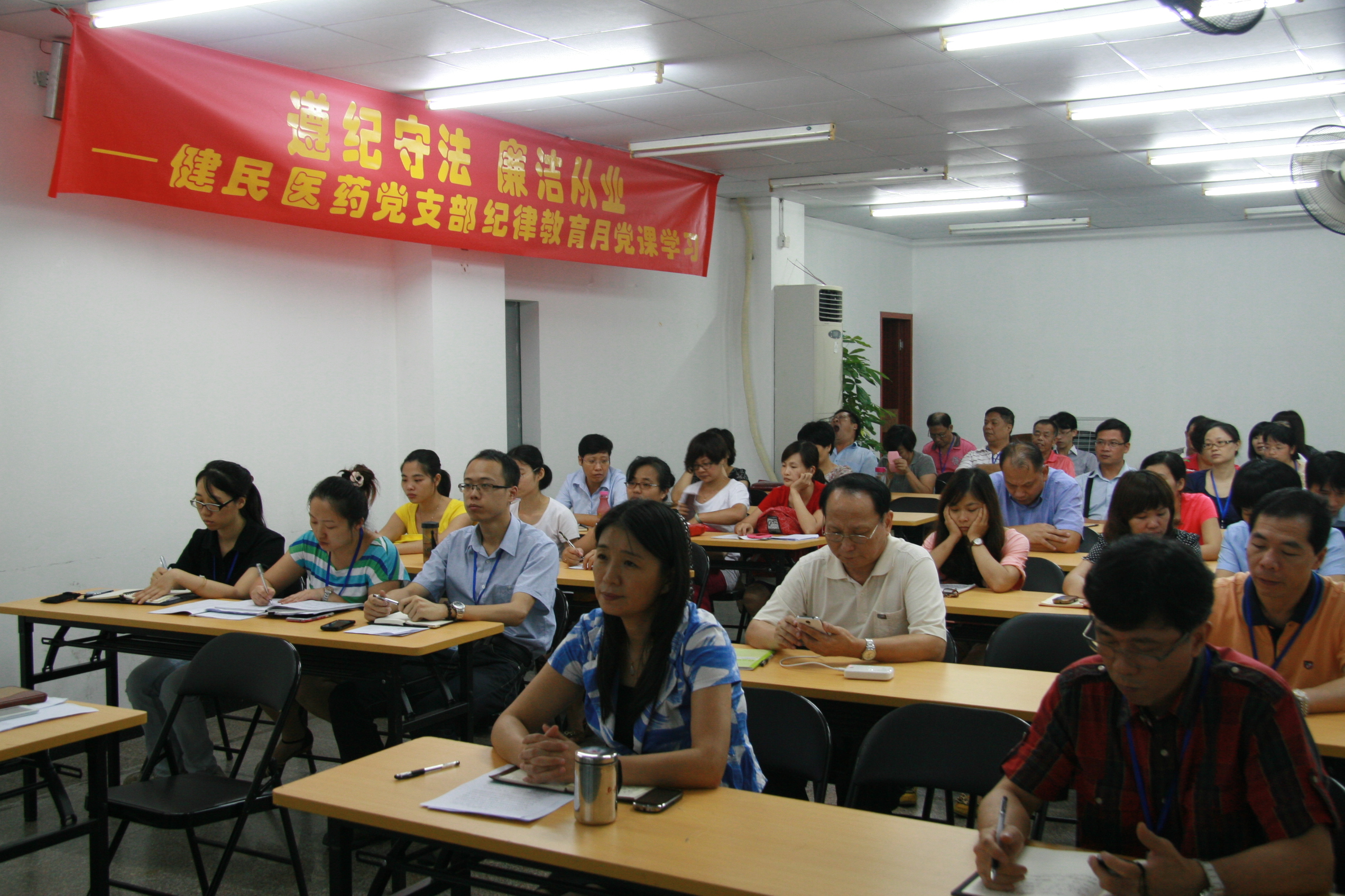 廣州醫(yī)藥健民連鎖黨支部8月30日召開了以“遵紀(jì)守法,廉潔從業(yè)”為主題的紀(jì)律教育月黨課學(xué)習(xí)會。廣州醫(yī)藥健民連鎖黨支部書記、總經(jīng)理徐愛華,黨支部副書記、工會主席黃靖等領(lǐng)導(dǎo)以及全體黨員、各部門主管、采購員、財務(wù)人員、入黨積極分子等共40多人參加了會議。會議由黃靖副書記主持,徐愛華書記作廉潔專題的授課。