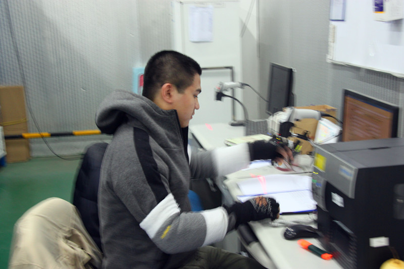 中秋節(jié)后首晚深夜,廣東十年強(qiáng)臺(tái)風(fēng)“天兔”登陸汕尾,廣州受其影響,夜間風(fēng)雨大作。雖然“天兔”奔粵,被風(fēng)雨籠罩夜幕下的黃金圍物流中心、獅山物流中心等倉(cāng)依然燈火通明,員工風(fēng)雨不改地堅(jiān)守各自崗位。若干年輕女員工“圍剿”堆積如山的單據(jù);穿著厚重棉襖和手襪的冷庫工作人員在低溫與常溫的環(huán)境下不停穿梭;分布倉(cāng)庫各層人員各施其職,甚至需要臨時(shí)調(diào)度支援;,凌晨時(shí)分,大伙干累干餓了,吃上一份窩心的夜宵后又埋頭苦干起來。這一幕幕的“雨夜風(fēng)景”,便是“天兔”咆哮下,黃金圍物流中心的真實(shí)寫照。