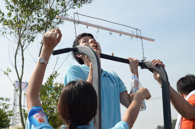 第二個(gè)環(huán)節(jié)是陸上趣味體能項(xiàng)目,包括大力士搬水、仰臥起坐投球、俯臥撐吸回形針、皮球穿呼啦圈和具人氣的引體向上吃餅干。這些項(xiàng)目既考驗(yàn)選手們的體能,又兼具技巧和趣味性,在場(chǎng)觀眾們?cè)跉g樂(lè)中見(jiàn)證著選手們的強(qiáng)健體魄。值得一提的是,在陸地項(xiàng)目中,許多女將的卓越表現(xiàn)讓人印象深刻。“中心名菜隊(duì)”的譚碧珊是唯一一個(gè)參與大力士搬水項(xiàng)目的女選手。大家都沒(méi)想到她嬌小的身軀下竟蘊(yùn)藏著強(qiáng)大的能量,可以在2分鐘內(nèi)搬運(yùn)桶裝水往返10米賽道20次。而來(lái)自省商業(yè)銷售部的呂文慧和陶欣欣兩位足球女將的表現(xiàn)也讓人驚喜,她們地完美配合實(shí)現(xiàn)了1分鐘內(nèi)皮球從10米外的呼啦圈中穿過(guò)7次,此成績(jī)并不亞于男選手們。