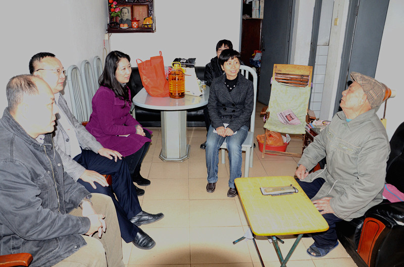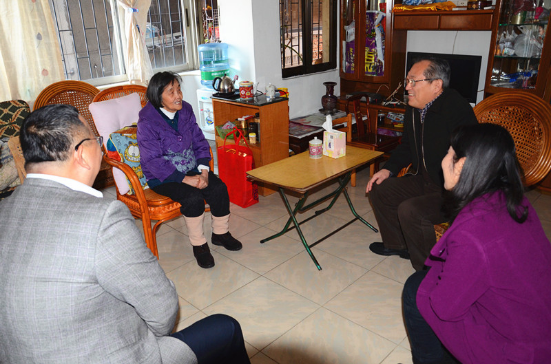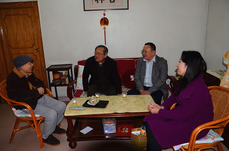 廣州醫(yī)藥黨委委員、總裁于景輝(右后)、廣州醫(yī)藥黨委書記蘇廣豐(左前)、廣州醫(yī)藥黨委副書記,工會主席楊瑞云(右前)慰問廣州醫(yī)藥老領導黃婉芳(左后)