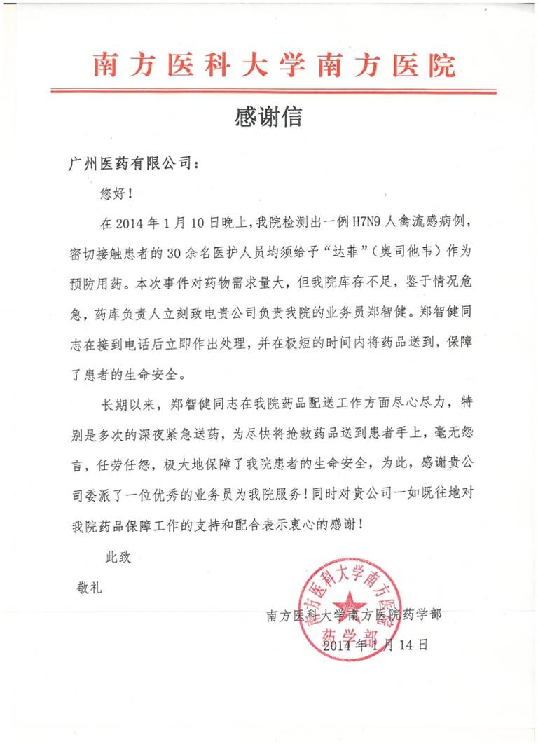 2014年新春伊始,在馬年的鞭炮聲逐漸臨近之際,一場H7N9的疫情危機也不期而至。面對廣東省內(nèi)醫(yī)療機構(gòu)急需流感預(yù)防用藥的情況,廣州醫(yī)藥業(yè)務(wù)人員積極克服困難,開展行動,本月來已累計開出達菲藥品近5000盒,累計藥品急送6人/次。我們的服務(wù)態(tài)度得到了廣大客戶的認可,近日南方醫(yī)院特地寄來感謝信,對我司同事鄭智健在應(yīng)急藥品配送工作中的突出表現(xiàn),表達了由衷的感謝。